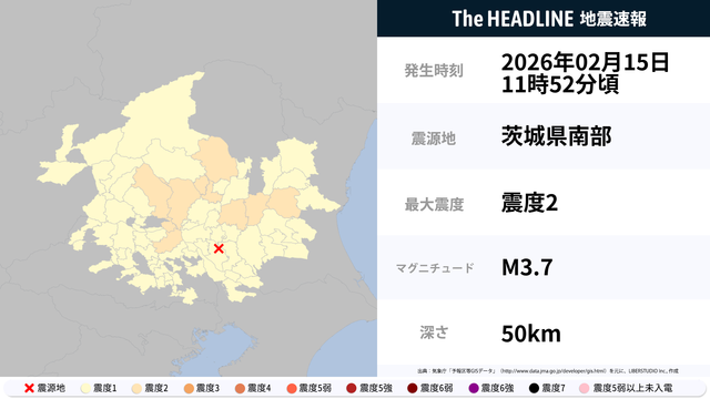 2月15日11時52分頃、茨城県・栃木県などで最大震度2の地震を観測