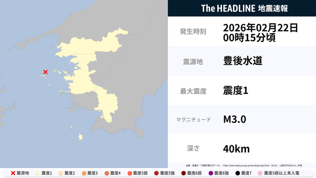 2月22日0時15分頃、豊後水道を震源とするマグニチュード3.0の地震が観測された。最大震度1を観測したのは、愛媛県・高知県。