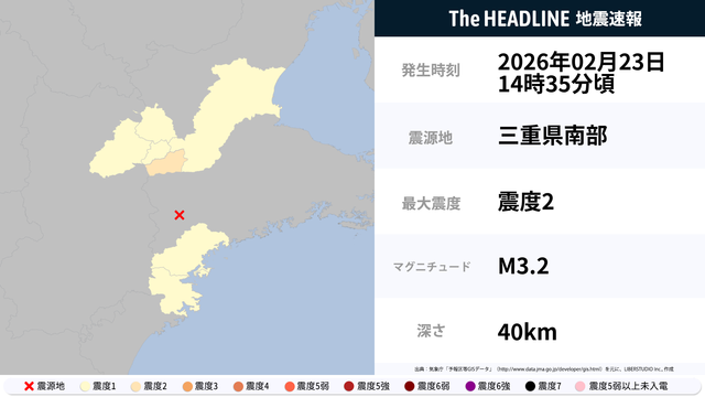 2月23日14時35分頃、三重県南部を震源とするマグニチュード3.2の地震が観測された。最大震度2を観測したのは、奈良県。