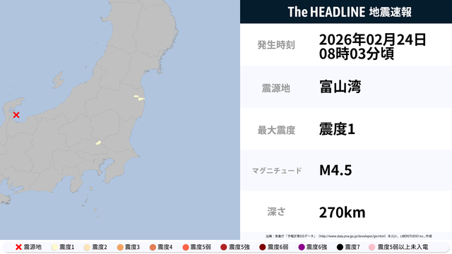 02月24日08時03分頃、富山湾を震源とするマグニチュード4.5の地震が観測された。最大震度1を観測したのは、福島県・埼玉県。