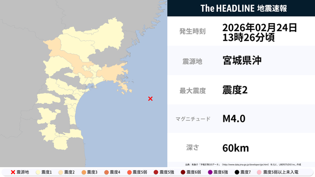 02月24日13時26分頃、宮城県沖を震源とするマグニチュード4.0の地震が観測された。最大震度2を観測したのは、宮城県。