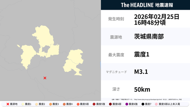 2月25日16時49分頃、茨城県・栃木県で最大震度1の地震を観測