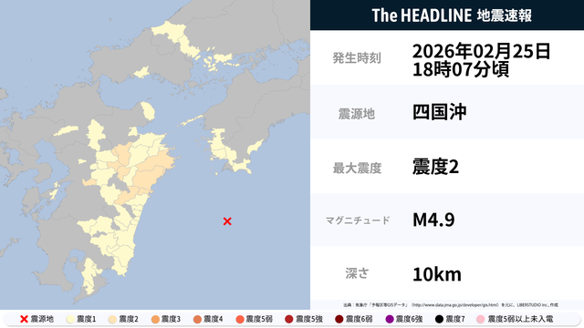 2月25日18時7分頃、四国沖を震源とするマグニチュード4.9の地震が観測された。最大震度2を観測したのは、熊本県・大分県など。