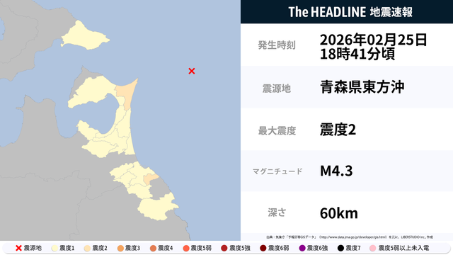 2月25日18時41分頃、青森県東方沖を震源とするマグニチュード4.3の地震が観測された。最大震度2を観測したのは、青森県。