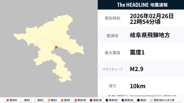 02月26日22時54分頃、岐阜県飛騨地方を震源とするマグニチュード2.9の地震が観測された。最大震度1を観測したのは、長野県・岐阜県。