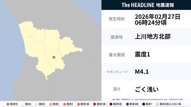 02月27日06時24分頃、上川地方北部を震源とするマグニチュード4.1の地震が観測された。最大震度1を観測したのは、北海道。