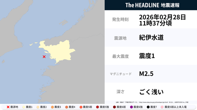 02月28日11時37分頃、紀伊水道を震源とするマグニチュード2.5の地震が観測された。最大震度1を観測したのは、和歌山県。
