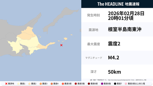 02月28日20時01分頃、根室半島南東沖を震源とするマグニチュード4.2の地震が観測された。最大震度2を観測したのは、北海道。