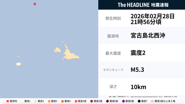2月28日21時56分頃、宮古島北西沖を震源とするマグニチュード5.3の地震が観測された。最大震度2を観測したのは、沖縄県。