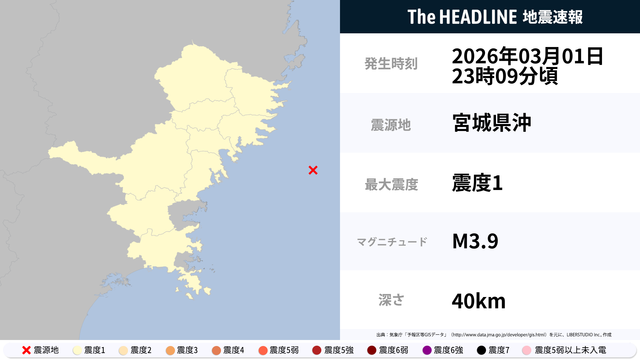 03月01日23時09分頃、宮城県沖を震源とするマグニチュード3.9の地震が観測された。最大震度1を観測したのは、岩手県・宮城県。