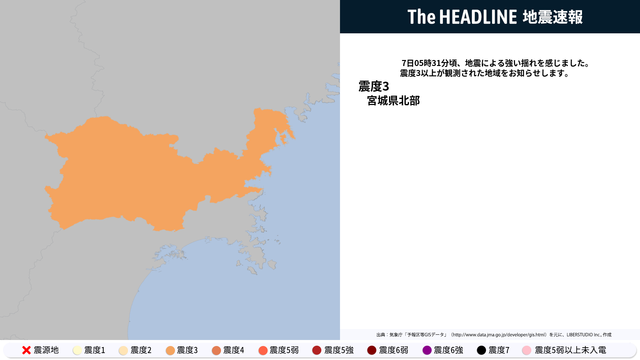 3月7日5時31分頃、宮城県北部で震度3以上の地震を観測した。現時点の発表では、宮城県北部で最大震度3の観測が発表されている。