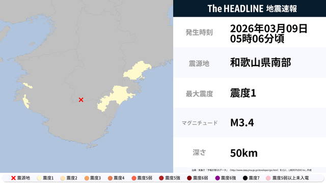 3月9日5時6分頃、和歌山県南部を震源とするマグニチュード3.4の地震が観測された。最大震度1を観測したのは、三重県・和歌山県。