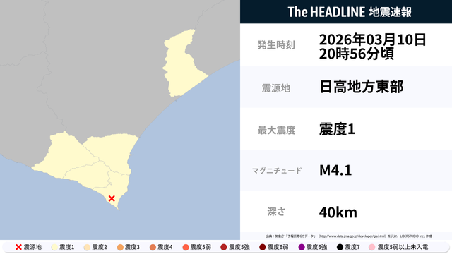 03月10日20時56分頃、日高地方東部を震源とするマグニチュード4.1の地震が観測された。最大震度1を観測したのは、北海道。