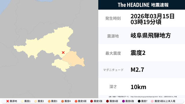 3月15日3時19分頃、岐阜県飛騨地方を震源とするマグニチュード2.7の地震が観測された。最大震度2を観測したのは、長野県。