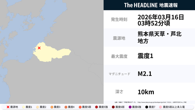 03月16日03時52分頃、熊本県天草・芦北地方を震源とするマグニチュード2.1の地震が観測された。最大震度1を観測したのは、熊本県。