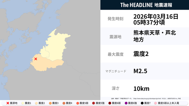 3月16日5時37分頃、熊本県天草・芦北地方を震源とするマグニチュード2.5の地震が観測された。最大震度2を観測したのは、熊本県。
