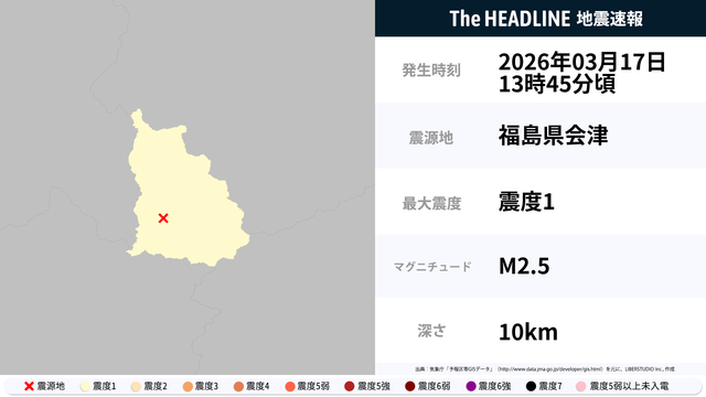 03月17日13時45分頃、福島県会津を震源とするマグニチュード2.5の地震が観測された。最大震度1を観測したのは、福島県。