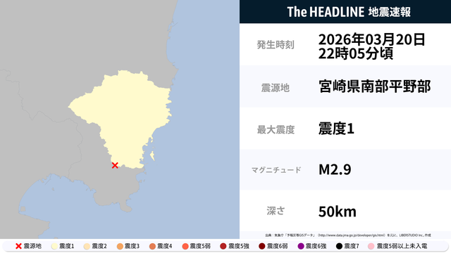 3月20日22時5分頃、宮崎県南部平野部を震源とするマグニチュード2.9の地震が観測された。最大震度1を観測したのは、宮崎県。