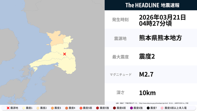3月21日4時27分頃、熊本県熊本地方を震源とするマグニチュード2.7の地震が観測された。最大震度2を観測したのは、熊本県。
