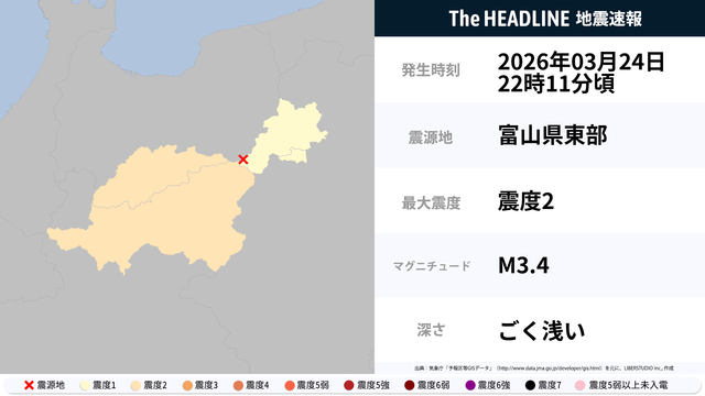 3月24日22時11分頃、富山県東部を震源とするマグニチュード3.4の地震が観測された。最大震度2を観測したのは、岐阜県。