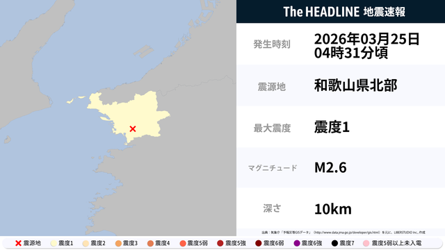 3月25日4時31分頃、和歌山県で最大震度1の地震を観測