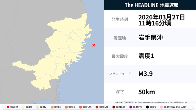 03月27日11時16分頃、岩手県沖を震源とするマグニチュード3.9の地震が観測された。最大震度1を観測したのは、岩手県・宮城県。