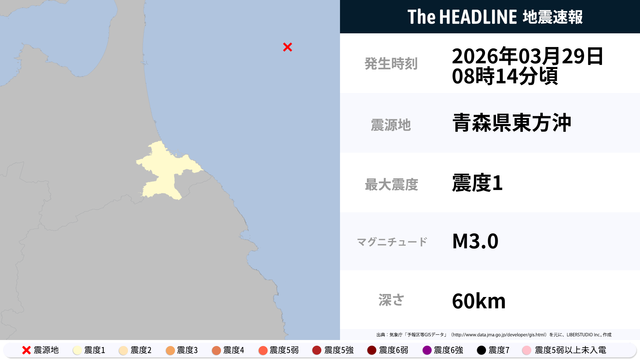 03月29日08時14分頃、青森県東方沖を震源とするマグニチュード3.0の地震が観測された。最大震度1を観測したのは、青森県。