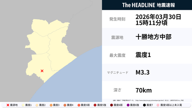 3月30日15時11分頃、十勝地方中部を震源とするマグニチュード3.3の地震が観測された。最大震度1を観測したのは、北海道。