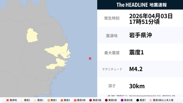 4月3日17時51分頃、岩手県沖を震源とするマグニチュード4.2の地震が観測された。最大震度1を観測したのは、岩手県。