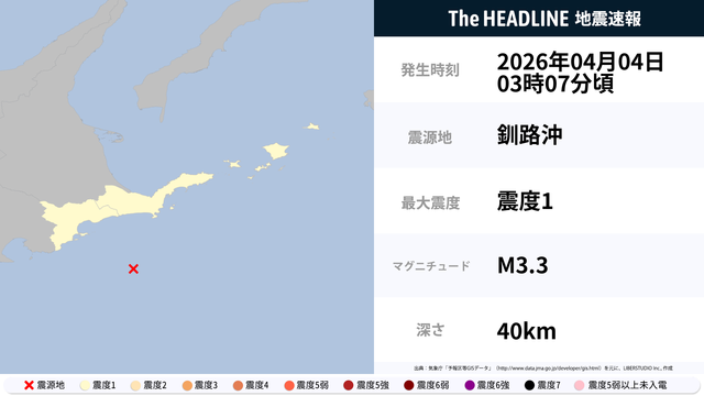 04月04日03時07分頃、釧路沖を震源とするマグニチュード3.3の地震が観測された。最大震度1を観測したのは、北海道。