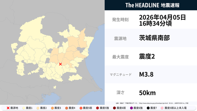 4月5日16時34分頃、茨城県・栃木県で最大震度2の地震を観測