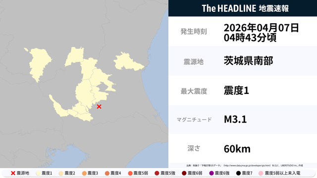 4月7日4時43分頃、茨城県・栃木県などで最大震度1の地震を観測
