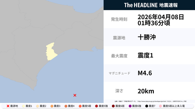 04月08日01時36分頃、十勝沖を震源とするマグニチュード4.6の地震が観測された。最大震度1を観測したのは、北海道。