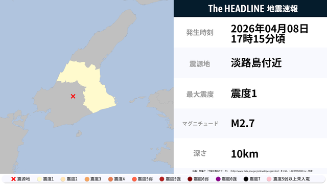 04月08日17時15分頃、淡路島付近を震源とするマグニチュード2.7の地震が観測された。最大震度1を観測したのは、兵庫県。