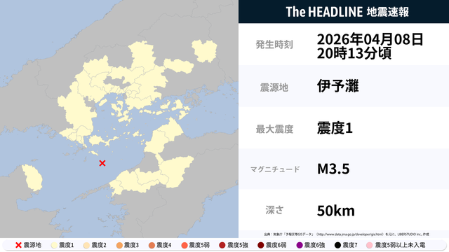04月08日20時13分頃、伊予灘を震源とするマグニチュード3.5の地震が観測された。最大震度1を観測したのは、広島県・山口県など。