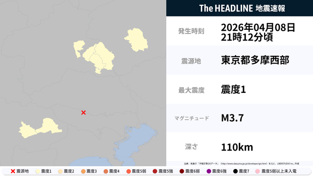 04月08日21時12分頃、東京都多摩西部を震源とするマグニチュード3.7の地震が観測された。最大震度1を観測したのは、栃木県・群馬県など。
