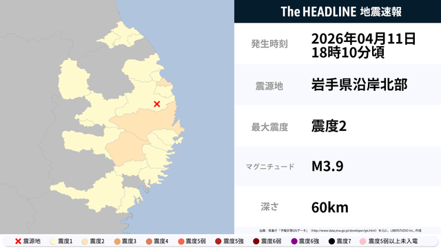 4月11日18時10分頃、岩手県沿岸北部を震源とするマグニチュード3.9の地震が観測された。最大震度2を観測したのは、岩手県。