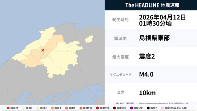 4月12日1時30分頃、島根県東部を震源とするマグニチュード4.0の地震が観測された。最大震度2を観測したのは、島根県。