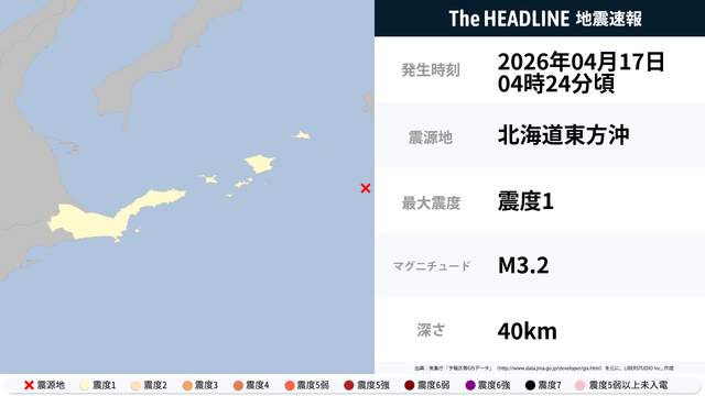 4月17日4時24分頃、北海道東方沖を震源とするマグニチュード3.2の地震が観測された。最大震度1を観測したのは、北海道。