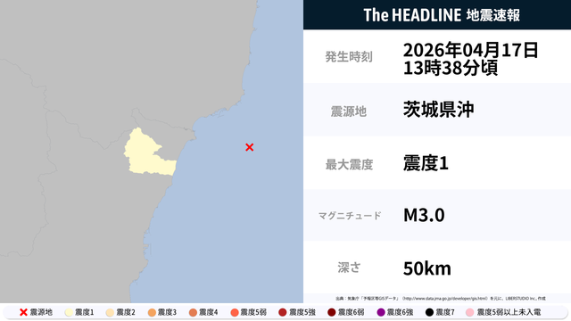 04月17日13時38分頃、茨城県沖を震源とするマグニチュード3.0の地震が観測された。最大震度1を観測したのは、茨城県。