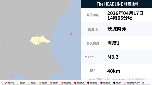 4月17日14時5分頃、茨城県沖を震源とするマグニチュード3.2の地震が観測された。最大震度1を観測したのは、茨城県。