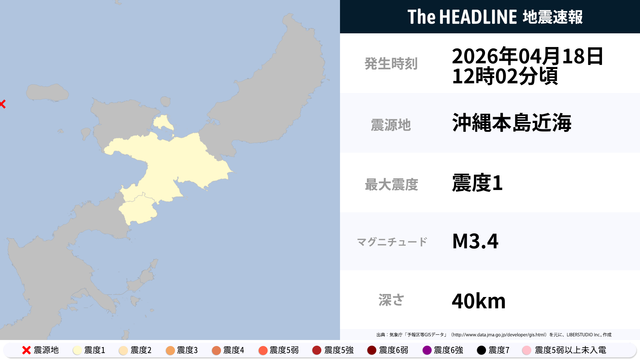 04月18日12時02分頃、沖縄本島近海を震源とするマグニチュード3.4の地震が観測された。最大震度1を観測したのは、沖縄県。