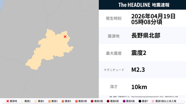 4月19日5時8分頃、長野県北部を震源とするマグニチュード2.3の地震が観測された。最大震度2を観測したのは、長野県。