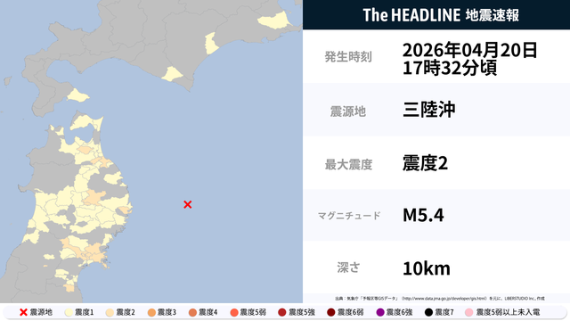 04月20日17時32分頃、三陸沖を震源とするマグニチュード5.4の地震が観測された。最大震度2を観測したのは、青森県・岩手県など。