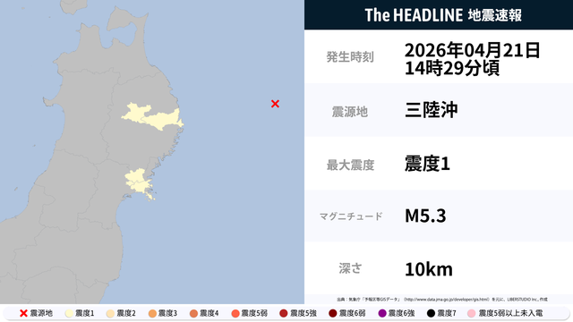 4月21日14時29分頃、三陸沖を震源とするマグニチュード5.3の地震が観測された。最大震度1を観測したのは、岩手県・宮城県。