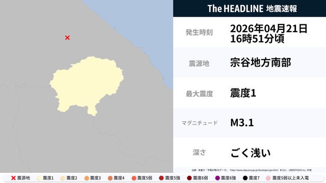 4月21日16時51分頃、北海道で最大震度1の地震を観測