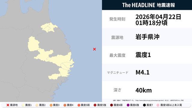 04月22日01時18分頃、岩手県沖を震源とするマグニチュード4.1の地震が観測された。最大震度1を観測したのは、青森県・岩手県。