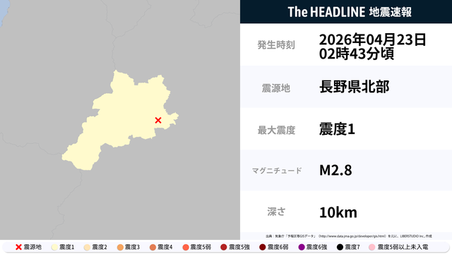 04月23日02時43分頃、長野県北部を震源とするマグニチュード2.8の地震が観測された。最大震度1を観測したのは、長野県。