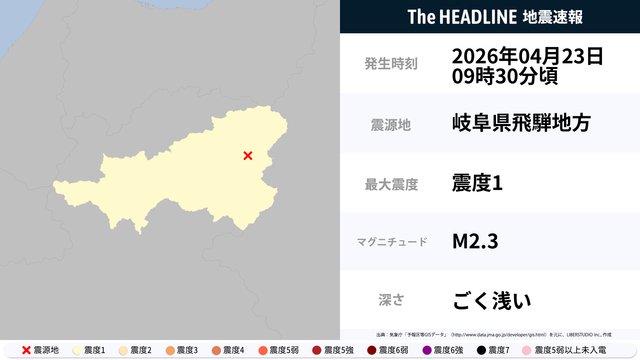 04月23日09時30分頃、岐阜県飛騨地方を震源とするマグニチュード2.3の地震が観測された。最大震度1を観測したのは、岐阜県。