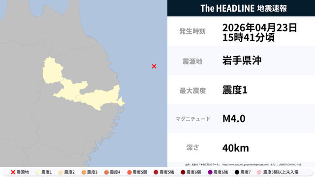 04月23日15時41分頃、岩手県沖を震源とするマグニチュード4.0の地震が観測された。最大震度1を観測したのは、岩手県。